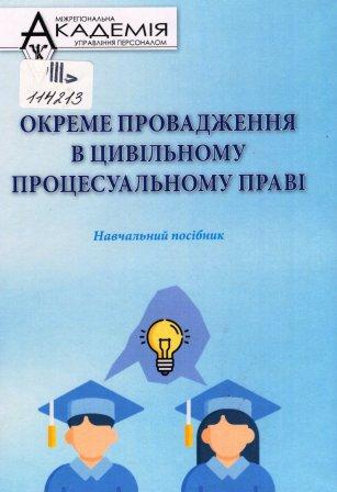 Коросташивець Ю. Г. Окреме провадження в цивільному процесуальному праві : посіб. для закл. вищ. освіти / Ю. Г. Коросташивець, Д. І. Минюк, О. Ю. Минюк ; ПрАТ "ВНЗ "Міжрегіональна академія управління персоналом" ; за заг. ред. В. О. Заросило. – Київ : Вид-во Людмила, 2024. – 143 с. : іл.