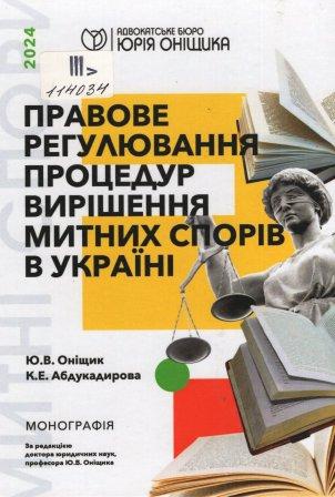 Оніщик Ю. В. Правове регулювання процедур вирішення митних спорів в Україні : монографія / Юрій Віталійович Оніщик, Каріне Ескендерівна Абдукадирова ; Адвокат. бюро "Юрія Оніщика" ; за ред. Юрій Віталійович Оніщик. – Одеса : Юридика, 2024. – 184 с.