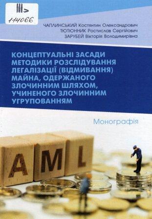 Чаплинський К. О. Концептуальні засади методики розслідування легалізації (відмивання) майна, одержаного злочинним шляхом, учиненого злочинним угрупованням : монографія / Костянтин Олександрович Чаплинський, Ростислав Сергійович Тютюнник, Вікторія Володимирівна Зарубей ; Дніпропетр. держ. ун-т внутріш. справ. – Одеса : Юридика, 2024. – 272 с. : табл.