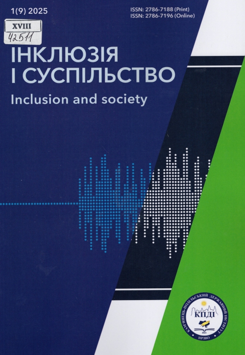Інклюзія і суспільство = Inclusion and society : наук. журн. / Засновник Навч.-реабілітац. закл. вищ. освіти "Кам'янець-Подільський держ. ін-т" ; гол. ред. Мар'ян Миколайович Тріпак. – Одеса; Кам'янець-Подільський : Гельветика, 2025. – Вип. 1 (9). – 131 с.