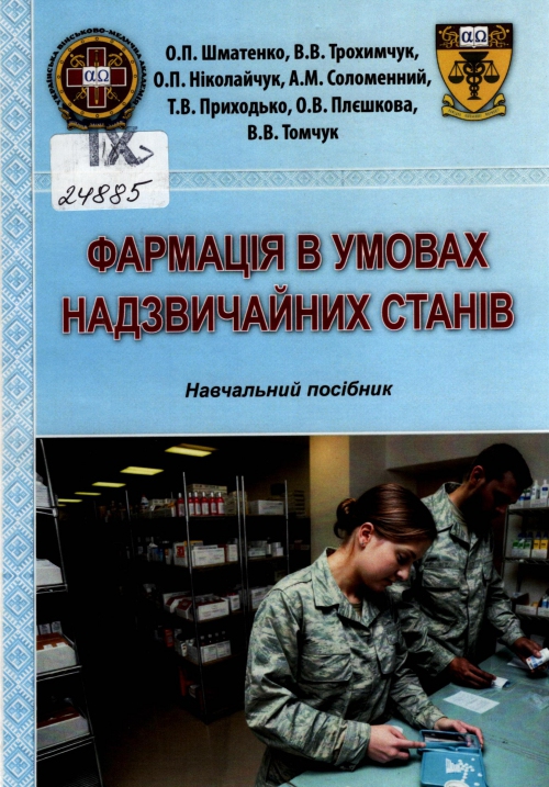 Фармація в умовах надзвичайних станів : навч. посіб. / Олександр Петрович Шматенко, Віктор Васильович Трохимчук, Олександр Павлович Ніколайчук, Андрій Миколайович Соломенний, Тетяна Володимирівна Приходько ; М-во оборони України, Укр. військ.-мед. акад., Каф. військ. фармації. – Київ : Вид-во Людмила, 2024. – 199 с. : рис., табл.