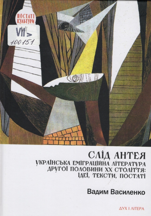 Василенко В. Слід Антея. Українська еміграційна література другої половини ХХ століття: ідеї, тексти, постаті / Вадим Василенко ; НАН України. Ін-т літератури ім. Т. Г. Шевченка ; наук. ред. Микола Жулинський. – Київ : Дух і Літера, 2024. – 654 с., [16] с. вкл. іл. : іл., фот., портр. – (Постаті культури). – The Trail of Antaeus. Ukrainian Émigré Literature of the Second Half of the XX century: ideas, texts, personalities.