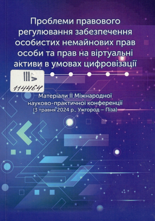 Проблеми правового регулювання забезпечення особистих немайнових прав особи та прав на віртуальні активи в умовах цифровізації : матеріали II Міжнар. наук.-практ. конф., 3 травня 2024 р., Ужгород-Піза / Ужгород. нац. ун-т, Юрид. ф-т, University of Pisa, Department of Law ; за заг. ред. Сібілла Богданівна Булеца, Марія Василівна Менджул. – Ужгород : УжНУ "Говерла", 2024. – 139 с.