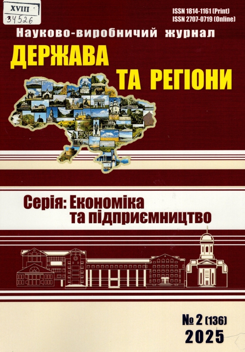 Держава та регіони. Серія: Економіка та підприємництво : наук.-виробн. журн. / Засновник Класичний приват. ун-т (м. Запоріжжя) ; гол. ред. О. І. Трохимець ; гол. редкол. О. В. Мащенко. – Запоріжжя : Класич. приват. ун-т, Запоріжжя; Одеса : Гельветика, 2025. – № 2 (136). – 125 с.