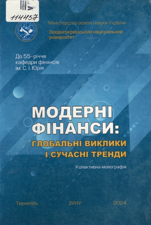 Модерні фінанси: глобальні виклики і сучасні тренди : кол. монографія / Західноукр. нац. ун-т (м. Тернопіль) ; гол. редкол. Андрій І. Крисоватий ; редкол. Ольга П. Кириленко, Володимир П. Горин, Зоряна М. Лободіна ; за ред. і передм. Андрій І. Крисоватий. – Тернопіль : ЗУНУ : Економічна думка, 2024. – 1010 с. : рис., табл.