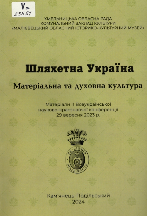 Шляхетна Україна. Матеріальна та духовна культура : матеріали II Всеукр. наук.-краєзнав. конф., 29 вересня 2023 р. / Хмельн. обл. рада, Ком. заклад культури "Малієвецький обласний іст.-культ. музей" ; вступ. сл. Олег Погорілець. – Кам'янець-Подільський : Друкарня "Рута", 2024. – 176 с. : іл., фотоіл., портр.– Шляхетна Україна. Матеріальна та духовна культура : матеріали IІ Всеукр. наук.-краєзнав. конф., 29 вересня 2023 р., Маліївці.