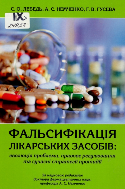 Лебедь С. О. Фальсифікація лікарських засобів: еволюція проблеми, правове регулювання та сучасні стратегії протидії : монографія / Сергій Олександрович Лебедь, Алла Семенівна Немченко, Ганна Володимирівна Гусева ; за наук. ред. Алла Семенівна Немченко. – Рівне : Волинські обереги, 2025. – 278 с. : фотоіл., табл.