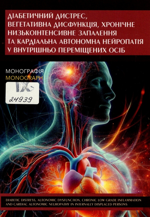 Сергієнко В. О. Діабетичний дистрес, вегетативна дисфункція, хронічне низькоінтенсивне запалення та кардіальна автономна нейропатія у внутрішньо переміщених осіб : монографія / Вікторія Олександрівна Сергієнко, Володимир Богданович Сегін, Олександр Олексійович Сергієнко. – Львів; Торунь : Liha-Pres, 2025. – 127 с. : табл. – Diabeticdistress, autonomicdysfunction, chroniclow-gradeinflammation, andcardiacautonomicneuropathyininternallydisplacedpersons.