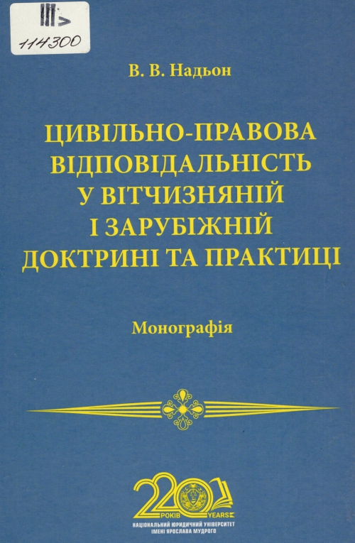 Надьон В. В. Цивільно-правова відповідальність у вітчизняній і зарубіжній доктрині та практиці : монографія / Вікторія Валентинівна Надьон ; Нац. юрид. ун-т ім. Я. Мудрого. – Харків : Право, 2024. – 414 с.