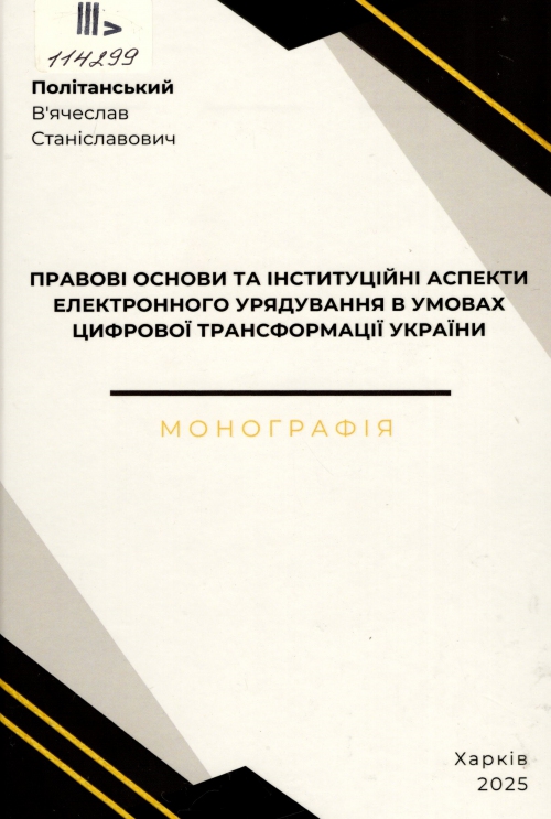 Політанський В. С. Правові основи та інституційні аспекти електронного урядування в умовах цифрової трансформації України : монографія / В'ячеслав Станіславович Політанський ; НДІ держ. буд-ва та місц. самоврядування НАПрН України. – Харків : Право, 2025. – 414 с.