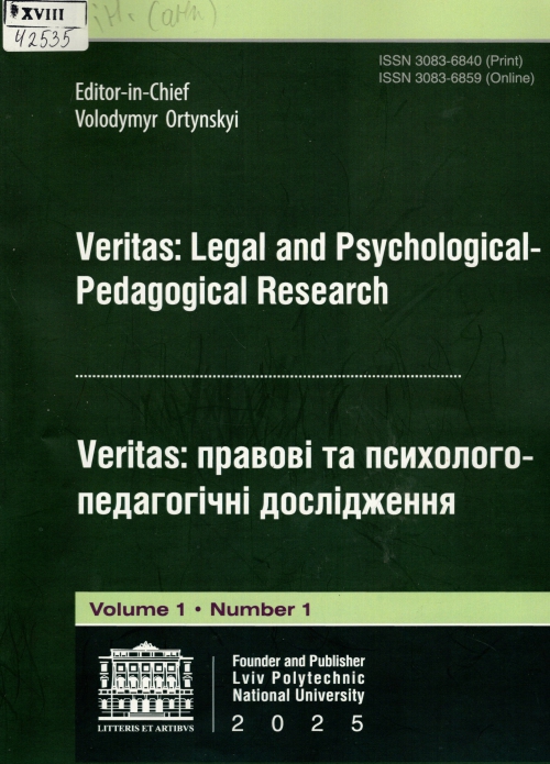 Veritas: Legal and Psychological-Pedagogical Research = Veritas: правові та психолого-педагогічні дослідження : наук. журн. / Publish. org. Lviv Polytechnic Nat. University ; Ed.-in-Ch. Volodymyr Ortynskiy. – Lviv : Lviv Polytech. Nat. Un-ty, 2025. – Vol. 1, no. 1. – 132 c.