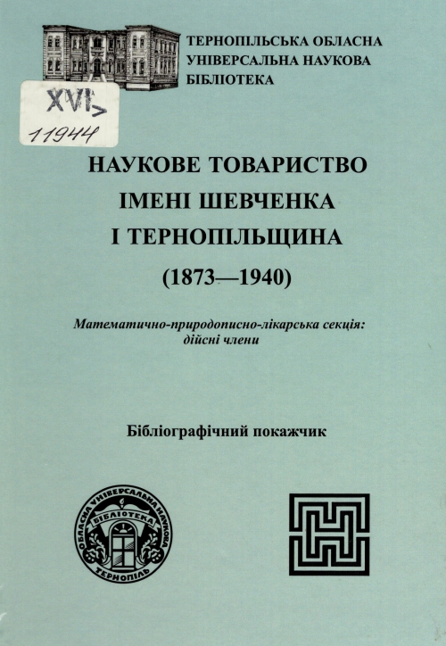 Наукове товариство імені Шевченка і Тернопільщина (1873-1940) : математично-природописно-лікарська секція: дійсні члени : бібліогр. покажч. / Департамент культури та туризму Терноп. обл. військ. адм., Терноп. обл. універс. наук. б-ка, Терноп. обл. осередок Наукового товариства ім. Шевченка ; уклад. і авт. передм. Л. Оленич ; вступ. ст. М. Андрейчин ; відп. за вип. В. Бачинський ; ред. О. Раскіна. – Тернопіль : Підручники і посібники, 2024. – 367 с.