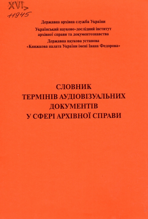 Словник термінів аудіовізуальних документів у сфері архівної справи / Держ. архів. служба України, Укр. НДІ архів. справи та документознавства, Держ. наук. установа "Книжкова Палата України ім. Івана Федорова" ; уклад. Віта Федорівна Бойко, Сергій Георгійович Кулешов, Ростислав Володимирович Романовський. – Київ : УНДІАСД, 2024. – 57 с.