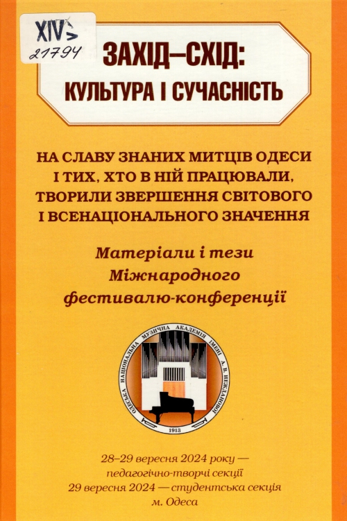 Захід - Схід: культура і сучасність - на славу знаних митців Одеси і тих, хто в ній працювали, творили звершення світового і всенаціонального значення : матеріали і тези Міжнар. фестивалю-конф., 28-29 вересня 2024 р. - педагогічно-творчі секції : 29 вересня 2024 р. - студентська секція, м. Одеса : / Одес. нац. муз. акад. ім. А. В. Нежданової, Одес. орг. Нац. спілки композиторів України ; оргком. Олена Михайлівна Хіль, Лілія Михайлівна Шевченко, Оксана Миколаївна Маркова. – Одеса : Астропринт, 2025. – 206 с.