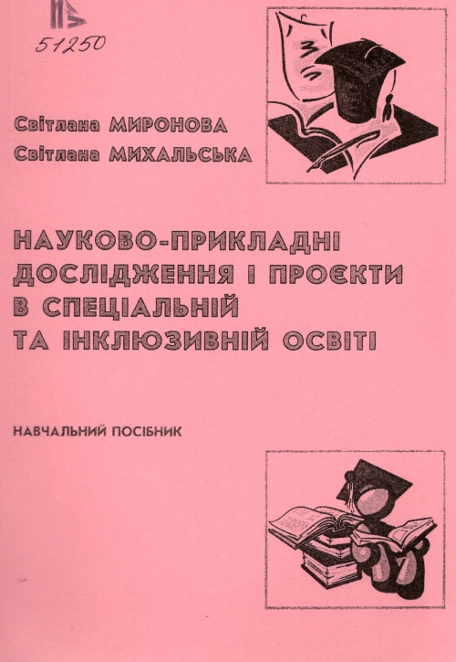 Миронова С. П. Науково-прикладні дослідження і проєкти в спеціальній та інклюзивній освіті : навч. посіб. / Світлана Петрівна Миронова, Світлана Анатоліївна Михальська ; Кам'янець-Подільський нац. ун-т ім. Івана Огієнка. – Кам'янець-Подільський : Кам'янець-Подільський нац. ун-т ім. Івана Огієнка, 2024. – 127 с. : табл.