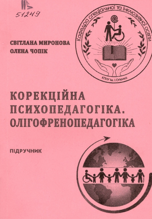 Миронова С. П. Корекційна психопедагогіка. Олігофренопедагогіка : підручник / Світлана Петрівна Миронова, Олена Василівна Чопік ; Кам'янець-Подільський нац. ун-т ім. Івана Огієнка. – Вид. 2-ге, перероб. та допов. – Кам'янець-Подільський : Кам'янець-Подільський нац. ун-т ім. Івана Огієнка, 2023. – 331 с. : рис., табл.