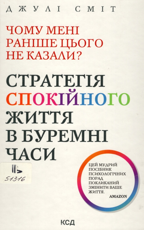 Сміт Джулі. Чому мені раніше цього не казали? : стратегія спокійного життя в буремні часи : пер. с англ. / Джулі Сміт ; пер. Дмитро Кожедуб. – Оновл. вид. – Харків : Книжковий Клуб "Клуб Сімейного Дозвілля", 2024. – 317, [1] с. : іл., табл.