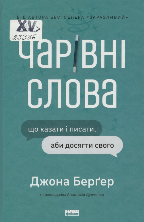 Які два слова змінили світ? Чому одні пісні стають хітами, а інші ні? Як зробити популярний подкаст і дістати підвищення? Це тільки частина питань, на які відповідає Джона Берґер. Зараз у ваших руках, безсумнівно, книжка про чарівні слова, що розкриє неочевидні наукові принципи того, як працюють фрази з такими словами і як за допомогою них переконувати, поглиблювати стосунки й бути успішнішими. Чому ці принципи наукові? Бо автор із командою проаналізував телефонні розмови працівників колцентрів, розібрав на атоми перемовини, ретельно дослідив онлайн-статті, сценарії фільмів і мільйони інтернет-відгуків. А ще — як лікарі спілкуються з пацієнтами і як проходять слухання про дострокові звільнення. І все це для того, щоб побачити ті самі чарівні слова, які тримають увагу, роблять вас авторитетнішими й цікавішими.