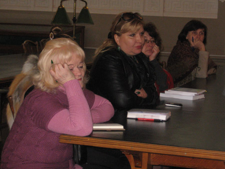 Організатори заходу, співробітники науково-методичного відділу ОННБ: Галина Устюжаніна (завідувач відділу), Світлана Гриценко (модератор), Тетяна Біла, провідний методист