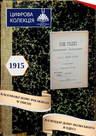 Dom Polski : kalendarz popularny na rok 1915 zwyczajny : z planem m. Odesy. Wydaw. rok 8. – Odesa : Południowo-Rosyjskie T-wo sztuki drukarskiej, 1915. – [10], 90, [8] s., 1 ark. mapy : il.