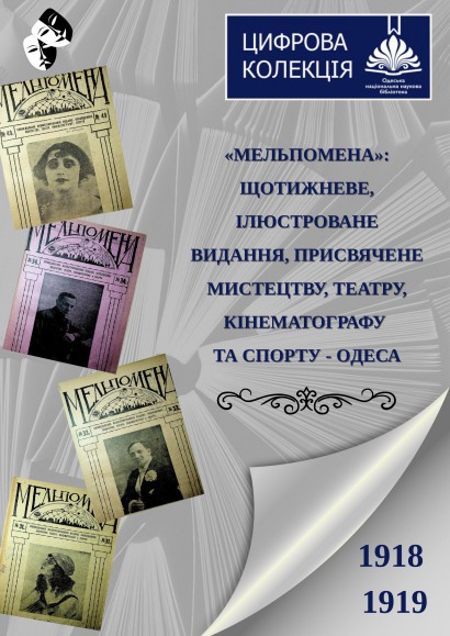 Мельпомена : еженедельное иллюстрированное издание, посвященное искусству, театру, кинематографу и спорту. – Одесса, 1918. – № 1-30, март-окт.; 1918. – № 31-39, нояб.-дек.; 1919. – № 40-65, янв.-март, сент.-дек. – В каждом номере 20 с.