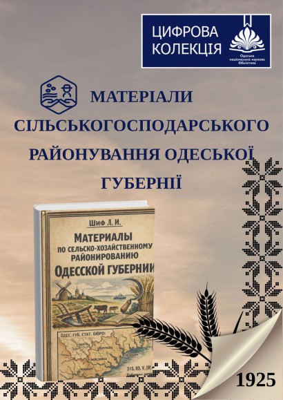 Шиф Л. И. Материалы по сельско-хозяйственному районированию Одесской губернии / Л. И. Шиф ; Одес. губ. стат. бюро. — Одесса, 1925. — 315, 93, V, [9] с., 1 л. к. : табл., к.