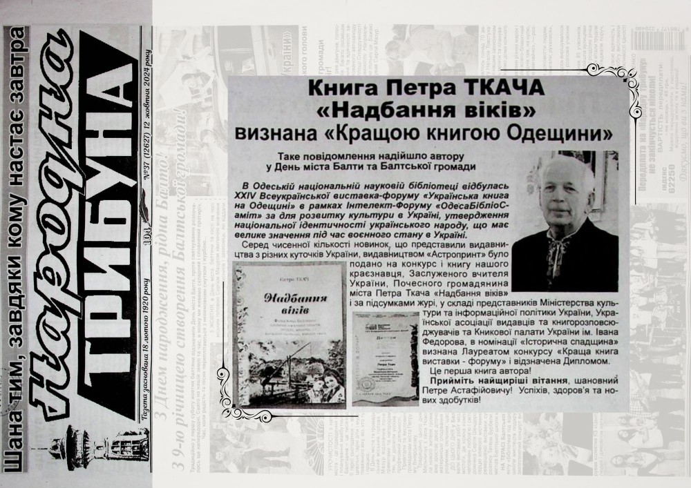 Книга Петра ТКАЧА «Надбання віків» визнана «Кращою книгою Одещини» [В Одеській національній науковій бібліотеці відбулась XXIV Всеукраїнська виставка-форум «Українська книга на Одещині» в рамках Інтелект-Форуму «ОдесаБібліоСаміт» за для розвитку культури в Україні, де книга краєзнавця, Заслуженого вчителя України в номінації «Історична спадщина» визнана Лауреатом конкурсу «Краща книга виставки-форуму» і відзначена Дипломом] // Народна трибуна. – 2024. – № 37 (12627). – 12 жовтня. – С. 3.