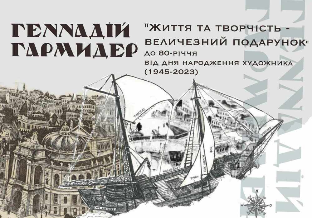 21 лютого виповнюється 80 років з дня народження відомого художника Геннадія Гармидера – живописця, графіка, книжкового ілюстратора, закоханого у своє місто одесита. «Він є справжнім співцем Одеси, якій присвятив понад 150 творів – своєрідний літопис міста від заснування до сьогодення. Його гравюри, виконані у техніці офорту, наповнені світлом сонця, терпкими пахощами моря, радістю буття. Легкий прозорий штрих створює святковий мажорний настрій... Твори Гармидера відзначаються високою майстерністю, філігранною технікою, вишуканим смаком, тонким одеським гумором» (з каталогу персональної виставки 2019 р. «Україна – Ізраїль. Одеса – Бат-Ям»).