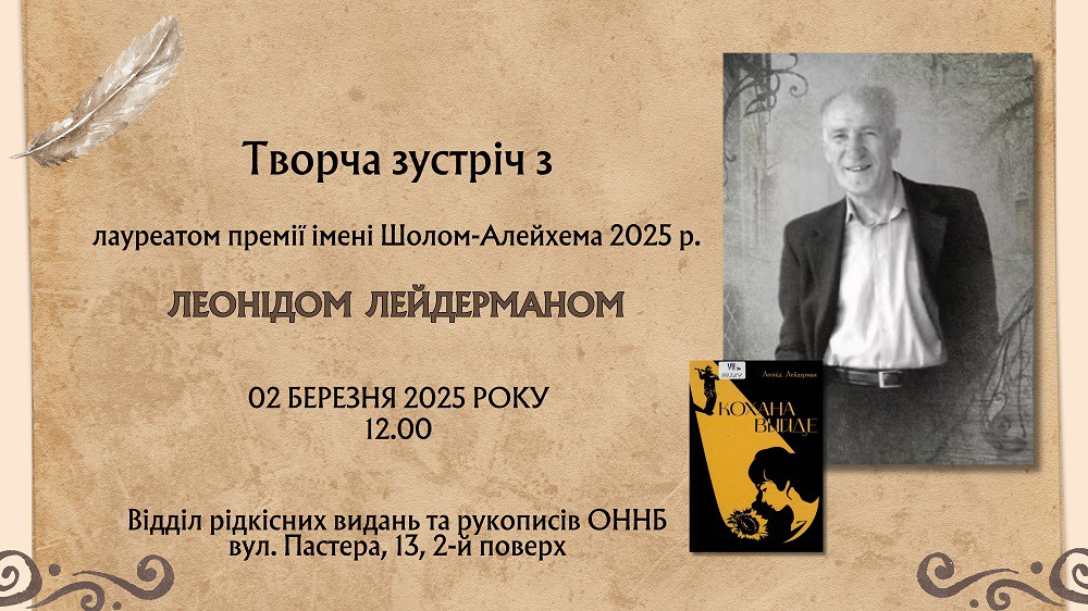 2 березня 2025 року о 12:00 у відділі рідкісних видань та рукописів Одеської національної наукової бібліотеки відбудеться творча зустріч з лауреатом Премії імені Шолом-Алейхема 2025 року Леонідом Лейдерманом.