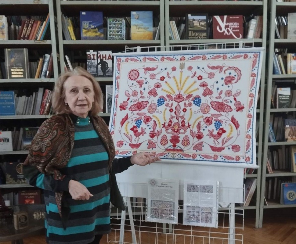 Свою роботу – барвисте панно «Вишивана Україна» представила Людмила Казанчук, лауреат обласної премії народних майстрів імені Ростислава Палецького (2019) провідний методист ООЦУК.
