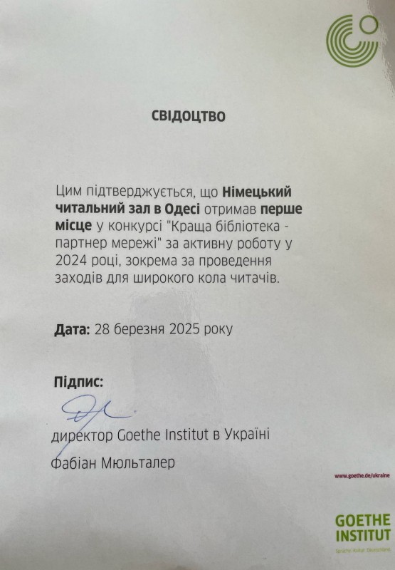 У березні 2025 року під час робочої зустрічі за підсумками щорічного конкурсу Goethe-Institut в Україні на кращу бібліотеку-партнера Одеська національна наукова бібліотека зайняла перше місце і єдина в Україні отримала приз – нові книжки українською мовою з колекції «Кращий дизайн», а також книжки для поповнення «Німецької полички в ОННБ».