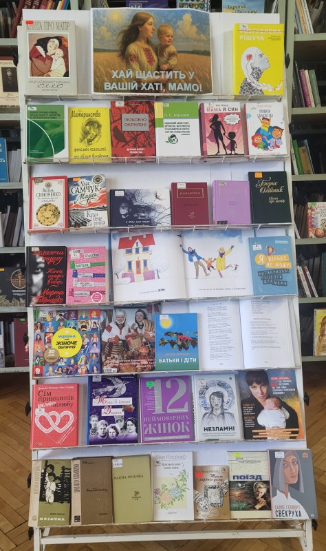 Книжкова виставка «Хай щастить у вашій хаті, мамо…» охоплює широкий спектр літератури: художню прозу, поезію, мемуари, фольклор, наукові праці та практичні порадники, що розкривають материнство у його духовному, емоційному, соціальному та історичному контекстах.