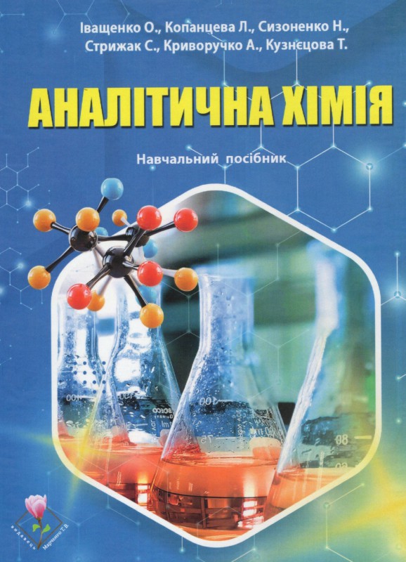 Аналітична хімія : навч. посіб. для здобувачів вищ. освіти спец. 226 «Фармація, пром. фармація» / авт.: Іващенко О., Копанцева Л., Сизоненко Н. [та ін.]. – Вид. 2-ге, випр. і допов. – Львів : Марченко Т.В., 2025. – 163 с. У книзі, підготовленій викладачами Полтавського державного медичного університету, представлено матеріал з теоретичних основ аналітичної хімії. Наведено різні види класифікації йонів за аналітичними групами, реакції виявлення катіонів та аніонів. Описано класичні методи кількісного та інструментального аналізу. |