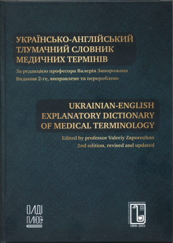 Українсько-англійський тлумачний словник медичних термінів. / упоряд.: В. Запорожан, В. Марічереда, О. Сікорська [та ін.] ; за ред. проф. Валерія Запорожана ; Одес. нац. мед. ун-т. – Вид. 2-ге, випр. та перероб. – Одеса : Олді+, 2025. – 630 с. – Обкл., тит. арк. укр., англ. Словник містить понад 15000 термінів із коротким тлумаченням їх українською мовою і поданням синонімічних варіантів багатьох термінологічних одиниць. Така побудова словника зробить навчальну та наукову літературу більш доступною для широкого кола фахівців – науковців, викладачів, вітчизняних здобувачів освіти та іноземців. |