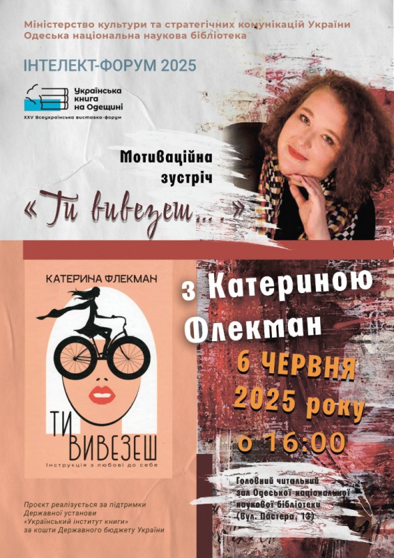 6 червня 2025 року о 16:00 у головному читальному залі Одеської національної наукової бібліотеки в рамках ХХV Всеукраїнської виставки-форуму «Українська книга на Одещині» відбудеться мотиваційна зустріч з письменницею, поетесою, психологинею, мотиваційною тренеркою, спікеркою, журналісткою, генеральною директоркою інформаційної агенції «Журналіст» Катериною Флекман.