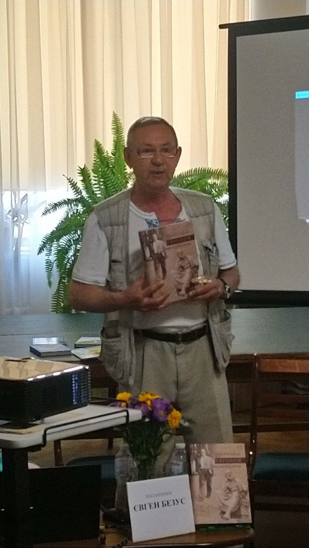Є. Безус розповів зацікавленій аудиторії про свій шлях до письменства – про післявоєнні часи, навчання у вишах (закінчив Дніпропетровський інститут залізничного транспорту та Дніпропетровський державний університет за фахом – інженер-радіофізик) та громадську діяльність.