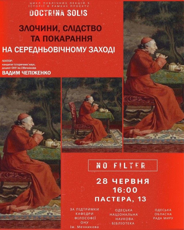 28 червня 2025 року в Одеській національній науковій бібліотеці, в рамках публічного освітнього філософського проєкту Доктрина Соліс, за підтримки Одеської обласної Ради Миру та кафедри філософії ОНУ ім. І.І.Мечникова відбудеться лекція-дискусія за участі кандидата історичних наук, доцента ОНУ ім. І.І.Мечникова Вадима Чепіженка «Злочини, слідство та покарання на середньовічному Заході».