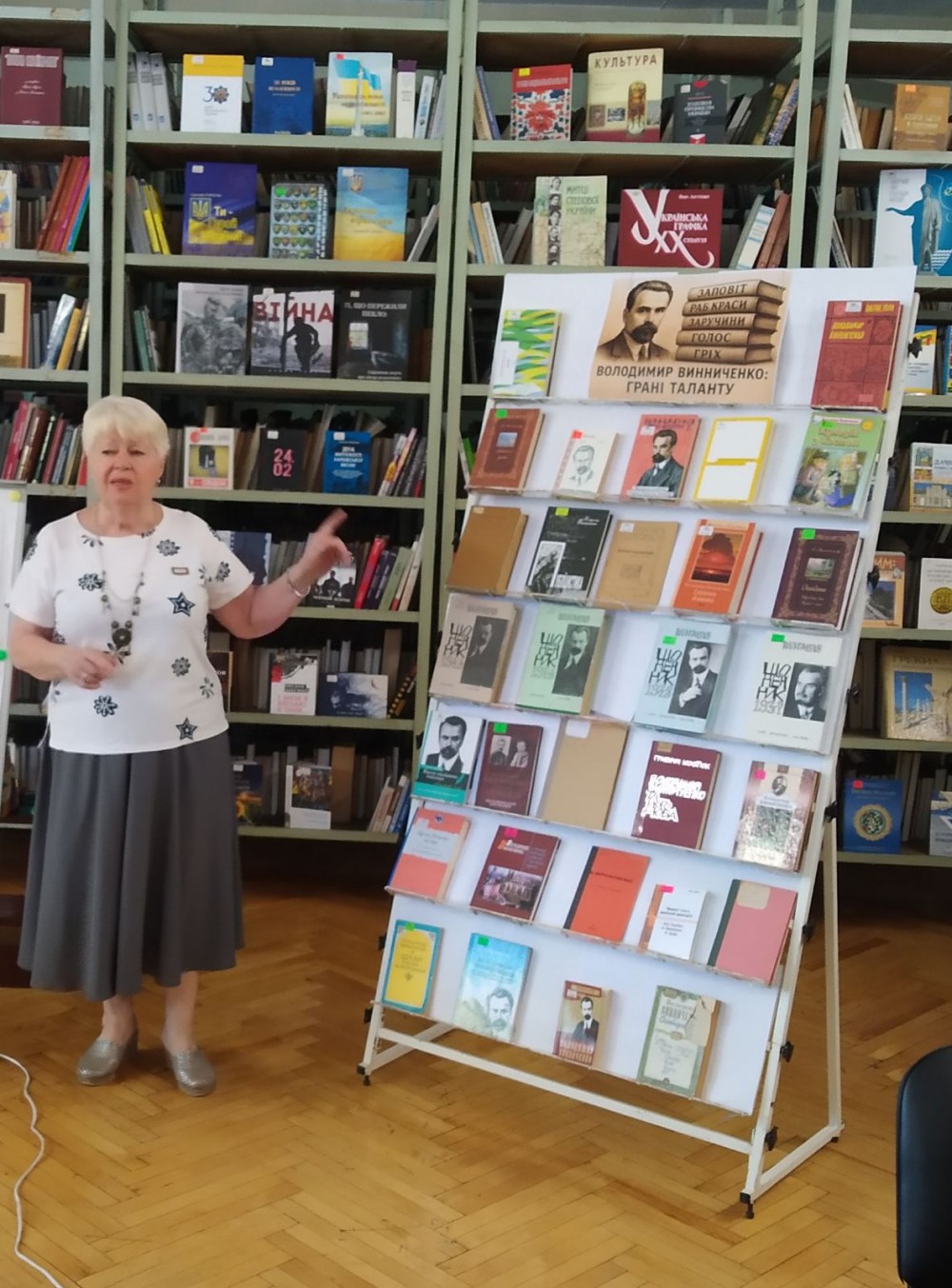 У центрі уваги під час зустрічі опинилася презентація виставки підготовленої нашими бібліотекарками та присвяченої ювілею Володимира Винниченка, яку професійно й цікаво представила пані Ананченко. Серед експонатів – роман «Заповіт батьків» (1914), драматичний твір «Заповіт борцям за визволення» та репродукції його живописних робіт, які відкрили ще одну, маловідому, але глибоку грань його таланту – Винниченка-художника.