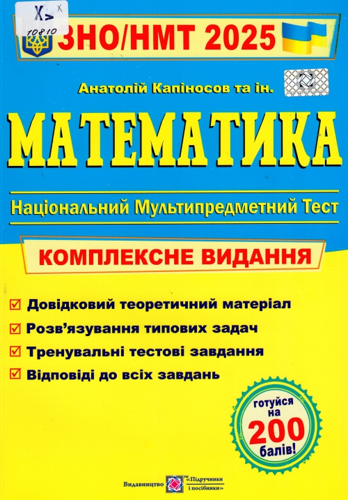 Капеняк І. Б. Математика. Комплексна підготовка до ЗНО/НМТ : за чинною програмою ЗНО / Іван Богданович Капеняк, Ярослав Тадейович Гринчишин, Олеся Миронівна Мартинюк.– Тернопіль : Підручники і посібники, 2024.– 558,[1] с. : іл., табл.– (ЗНО/НМТ. 2025) (Готуйся до НМТ 200 балів) (Національний мультипредметний тест. 2025).