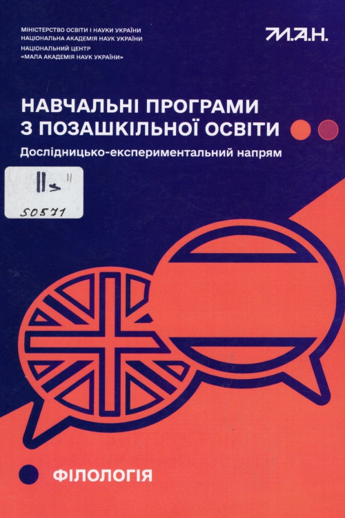 Навчальні програми з позашкільної освіти : дослід.-експеримент. напрям. Філологія / Ольга Володимирівна Біркадзе, Галина Георгіївна Верба, Алла Геннадіївна Вільчинська, Світлана Мар'янівна Іваненко, Тетяна Миколаївна Крекотіна ; Нац. акад. наук України, Нац. центр "Мала академія наук України" ; редкол. А. І. Грітчина, Т. М. Крекотіна ; вступ А. І. Грітчина. – Київ : Нац. центр "Мала академія наук України", 2024. – 178 с. : табл.