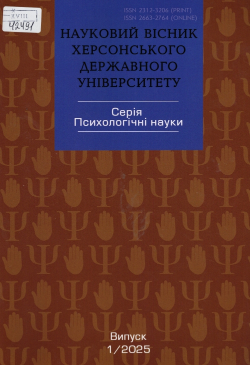 Науковий вісник Херсонського державного університету. Серія: Психологічні науки = Scientific bulletin of Kherson state university. Series: Psychological sciences : зб. наук. пр. / Засновник Херсон. держ. ун-т ; гол. ред. Наталія Іванівна Тавровецька. – Херсон : ХДУ ; Івано-Франківськ ; Одеса : Гельветика, Одеса : Гельветика, 2025. – Вип. 1. – 71 с.
