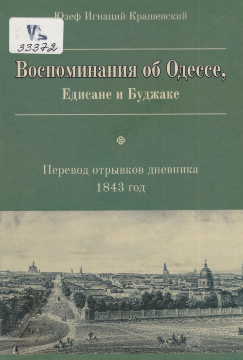 Крашевский Ю. И. Воспоминания об Одессе, Едисане и Буджаке : дневникпоездки в 1843 г. с 22 июня по 11 сентября Ю. И. Крашевского, действит. члена Одес. о-ва истории и древностей : переводотрывковдневника по изд.1845 г., описывающихпребывание в Одессе с 6 июля по 29 августа 1843 г. : пер. с пол. / Юзеф ИгнацийКрашевский ; пер. Стелла В. Михайлова ; ил. Е. А. Сокольский. – Одесса : Астропринт, 2022. – 251, [3] с. : ил.– Воспоминания об Одессе, Едисане и Буджаке. Переводотрывковдневника, 1843 год