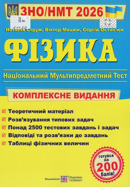 Фізика : комплексна підготовка до ЗНО/НМТ : за чинною прогр. ЗНО / Уклад. Наталія Іванівна Струж, Віктор Михайлович Мацюк, Сергій Іванович Остап'юк. – Тернопіль : Підручники і посібники, 2025. – 480 с. : іл., табл. – (ЗНО/НМТ. 2026) (Національний мультипредметний тест. 2026) (Готуйся на 200 балів!).