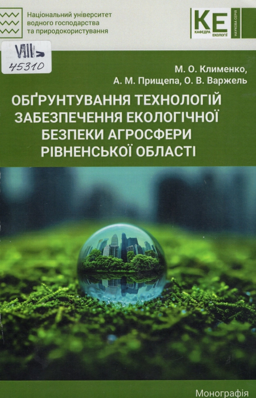 Клименко М. О. Обґрунтування технологій забезпечення екологічної безпеки агросфери Рівненської області : монографія / Микола Олександрович Клименко, Алла Миколаївна Прищепа, Ольга Валентинівна Варжель ; Нац. ун-т водного госп-ва та природокористування. – Рівне : НУВГП, 2024. – 153 с. : табл., мапи, схеми.