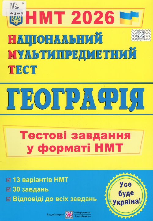 Кузишин А. В. Географія. Тестові завдання у форматі НМТ / Андрій Васильович Кузишин, Оксана Григорівна Заячук. – Тернопіль : Підручники і посібники, 2025. – 79, [1] : іл., табл., карти. – (Національний мультипредметний тест. 2026).