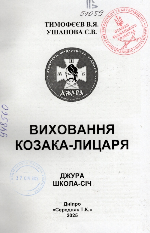 Тимофєєв В. Я. Виховання козака-лицаря : Джура. Школа-Січ / Валерій Якович Тимофєєв, Світлана Валеріївна Ушанова. – 5-те вид, перероб. і допов. – Дніпро : Середняк Т. К., 2025. – 400 с. : іл., фот., табл.
