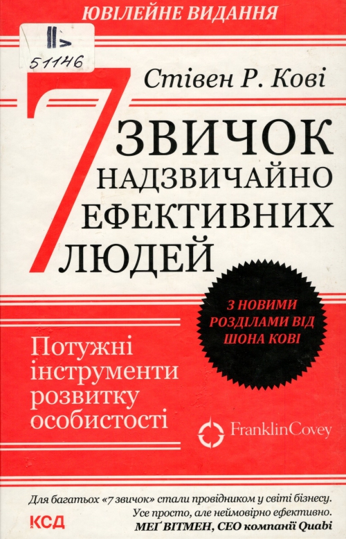 Кові С. Р. 7 звичок надзвичайно ефективних людей : потужні інструменти розвитку особистості : пер. с англ. / Стівен Р. Кові ; пер. Олена Любенко ; переднє слово Джим Коллінз ; передм. Шон Кові. – Ювіл. вид.– Харків : Книжковий Клуб "Клуб Сімейного Дозвілля", 2023. – 511 с. : іл., табл. – Сім звичок надзвичайно ефективних людей.