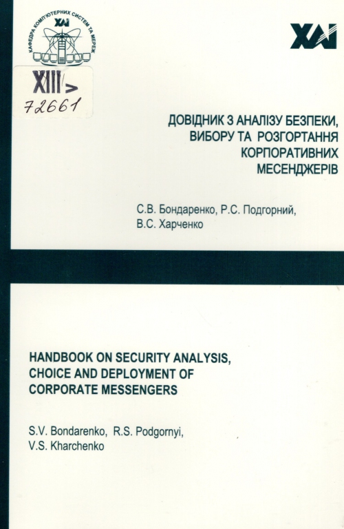 Бондаренко С. В. Довідник з аналізу безпеки, вибору та розгортання корпоративних месенджерів : навч. посіб. / Сергій Володимирович Бондаренко, Руслан Сергійович Подгорний, Вячеслав Сергійович Харченко ; Нац. аерокосм. ун-т ім. М. Є. Жуковського "Харківський авіаційний інститут". – Харків : Нац. аерокосм. ун-т ім. М. Є. Жуковського "Харк. авіац. ін-т", 2024. – 174 с. : рис., табл. – Handbook on security analysis, choice and deployment of corporate messengers.
