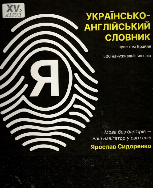 Сидоренко Я. І. Українсько-англійський словник шрифтом Брайля : 500 найуживаніших слів / Ярослав Ігорович Сидоренко. – Кропивницький : Імекс-ЛТД, 2025. – 89 с.