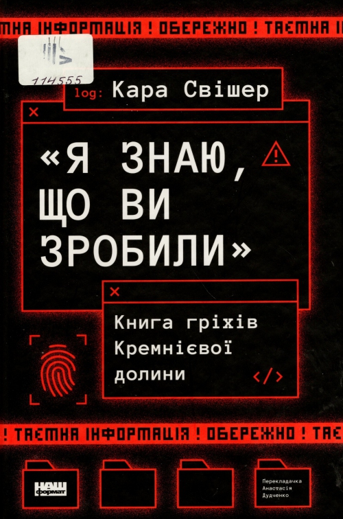 Свішер Кара. "Я знаю, що ви зробили" : книга гріхів кремнієвої долини : пер. с англ. / Кара Свішер ; пер. Анастасія Дудченко. – Київ : Наш Формат, 2025. – 271 с.